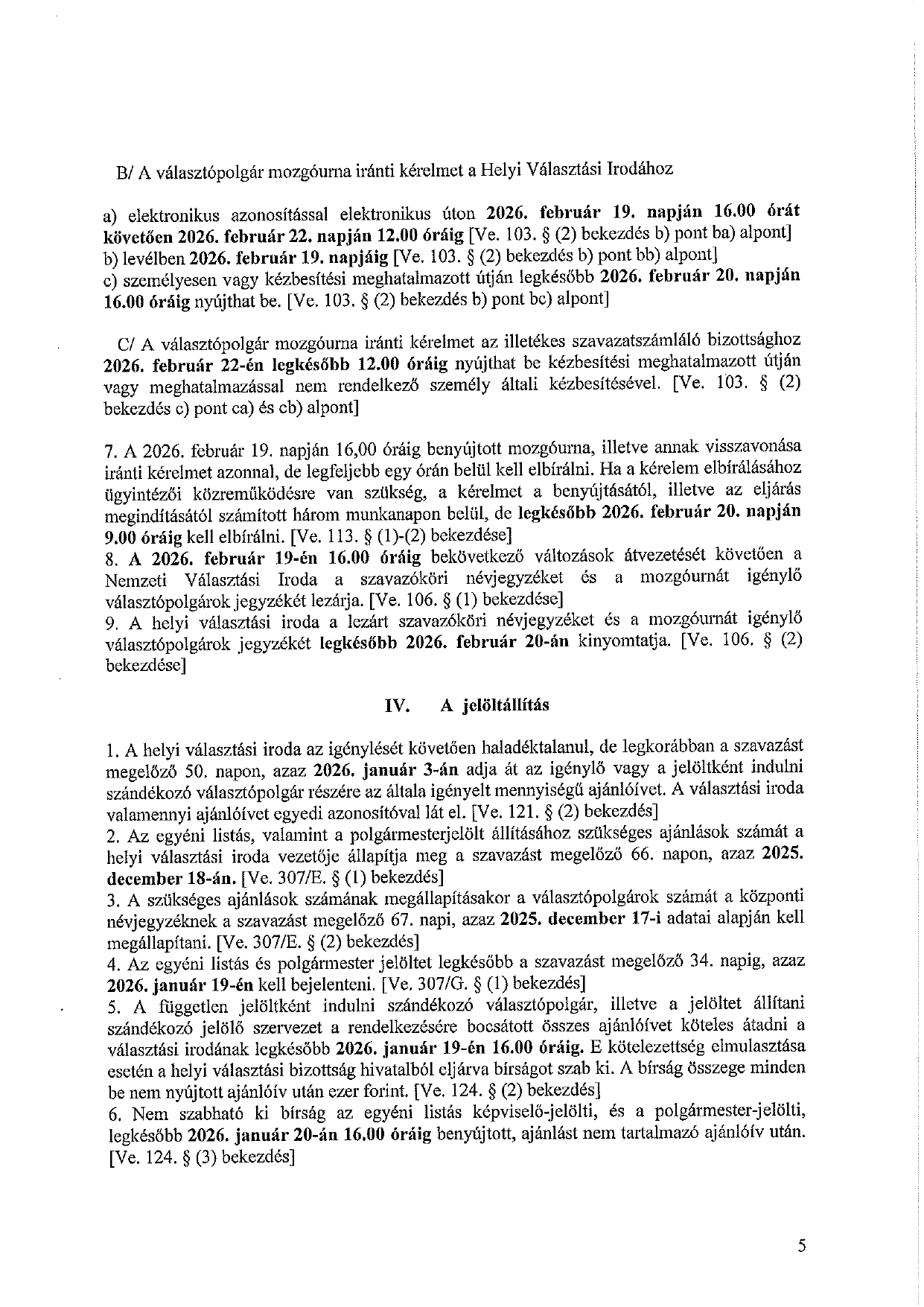 A választási eljárásról szóló 2013. évi XXXVI. törvény (a továbbiakban: Ve.) szerint a választást úgy kell kitűzni, hogy a magyarországi szavazás napja a kitűzés napját követő hetvenedik és kilencvenedik nap közé essen. Az időközi választást a mandátum megüresedésétől számított százhúsz napon belülre kell kitűzni. A települési önkormányzati képviselők és a polgármester időközi választását a helyi választási bizottság tűzi ki.
