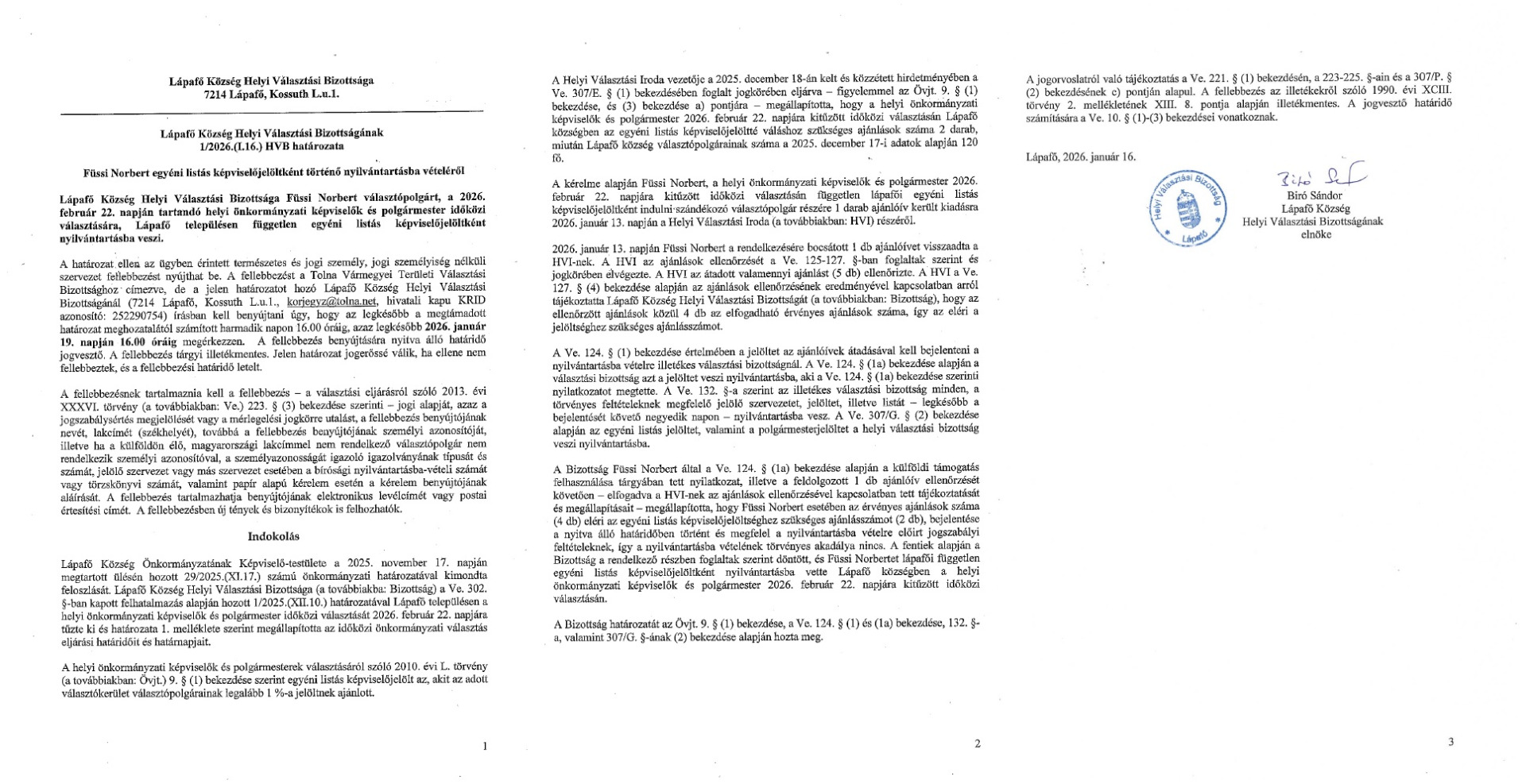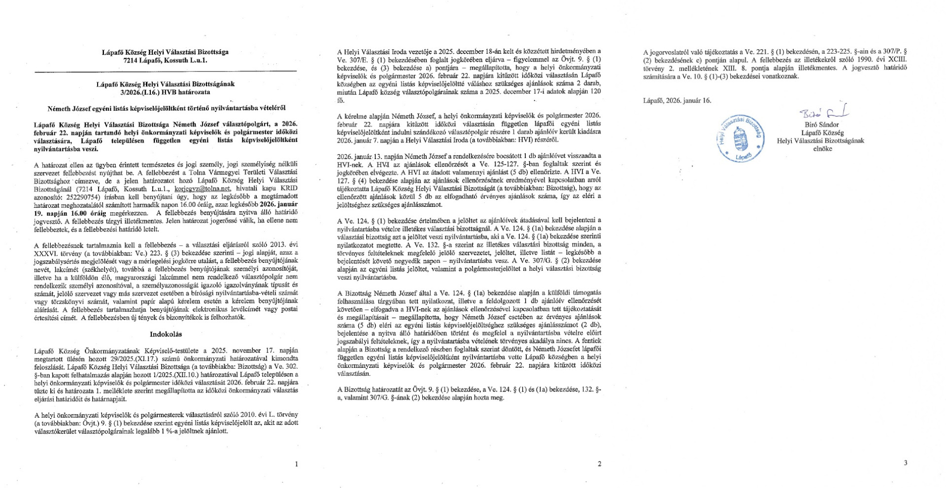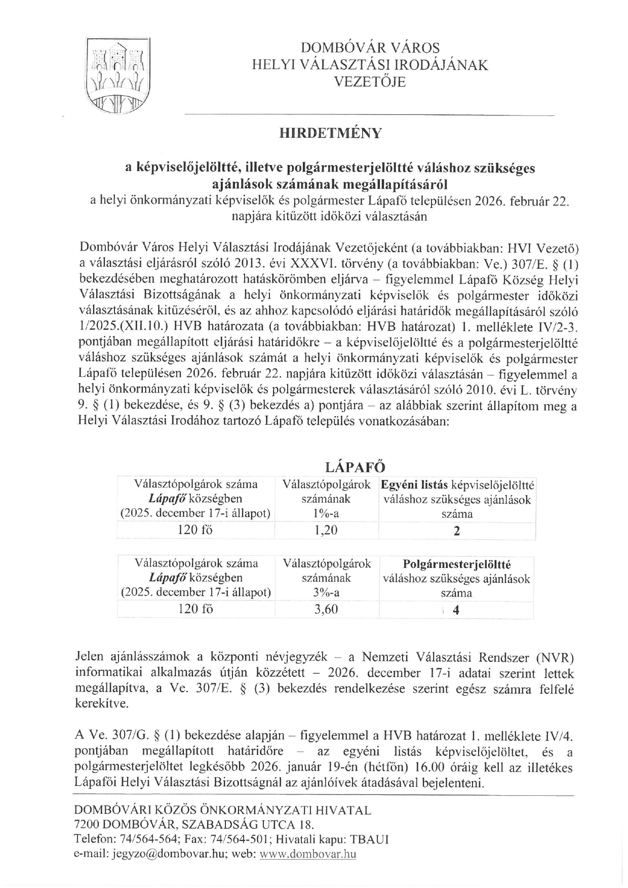 Ezúton tájékoztatom Lápafő község lakosságát, hogy Lápafő Község Képviselő Testületének