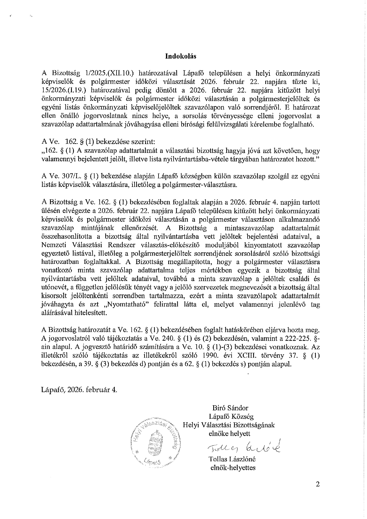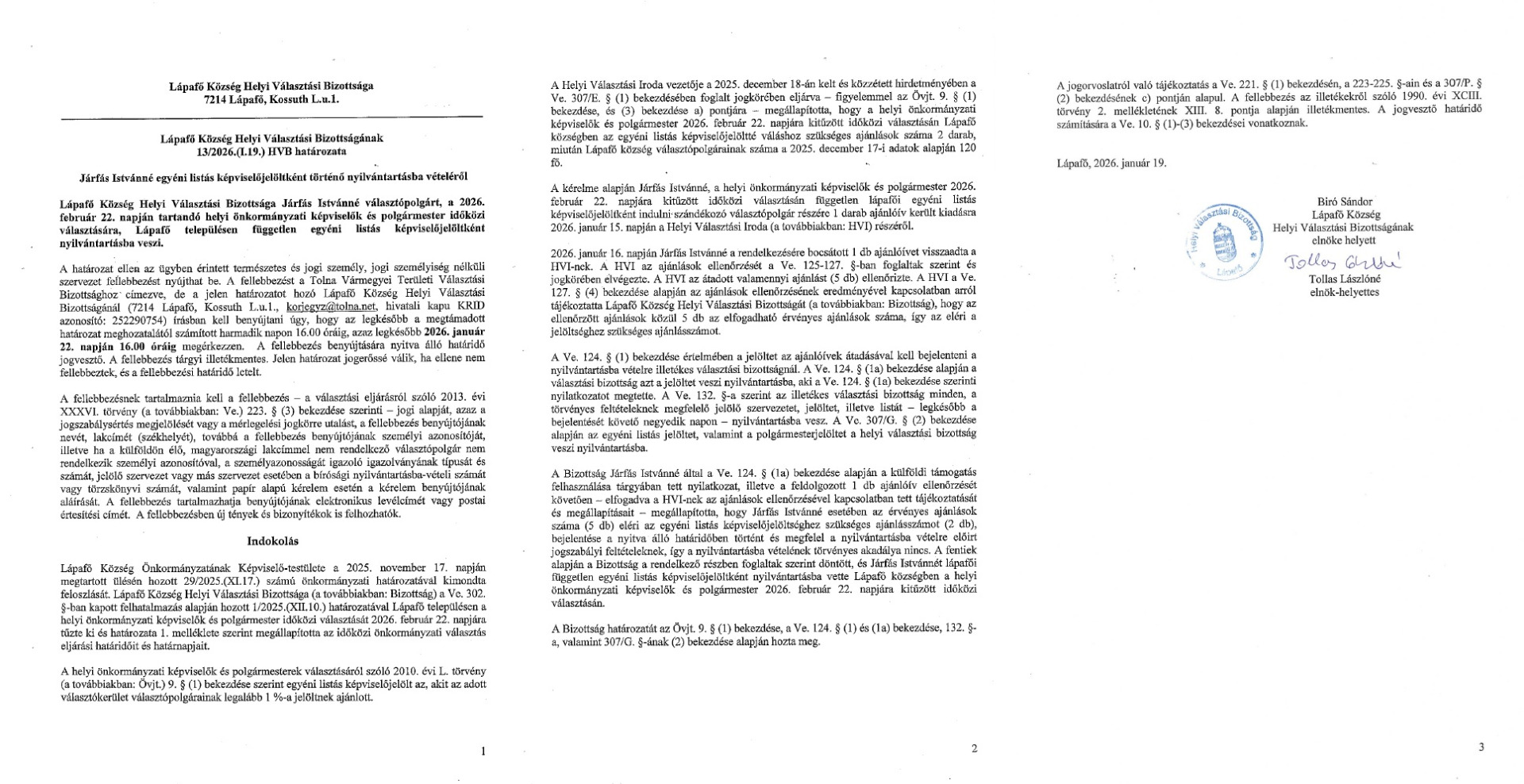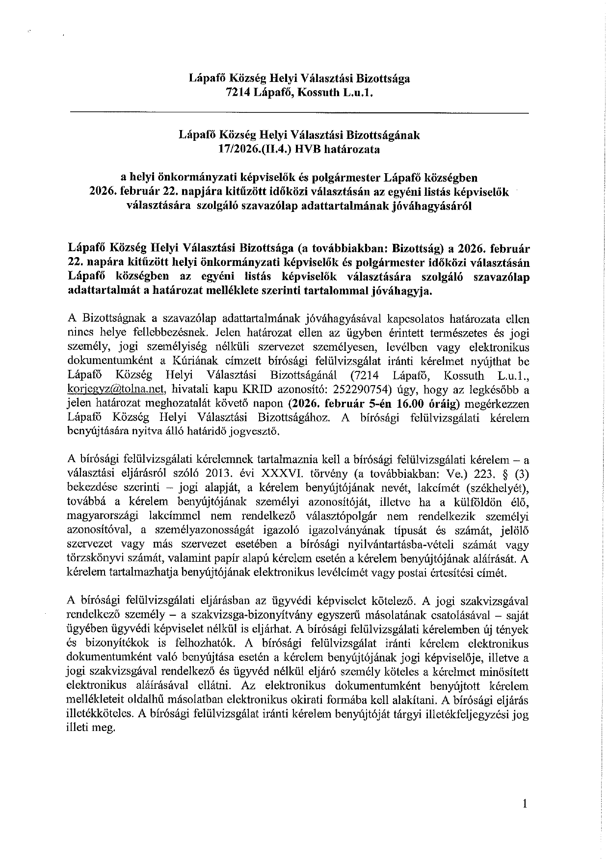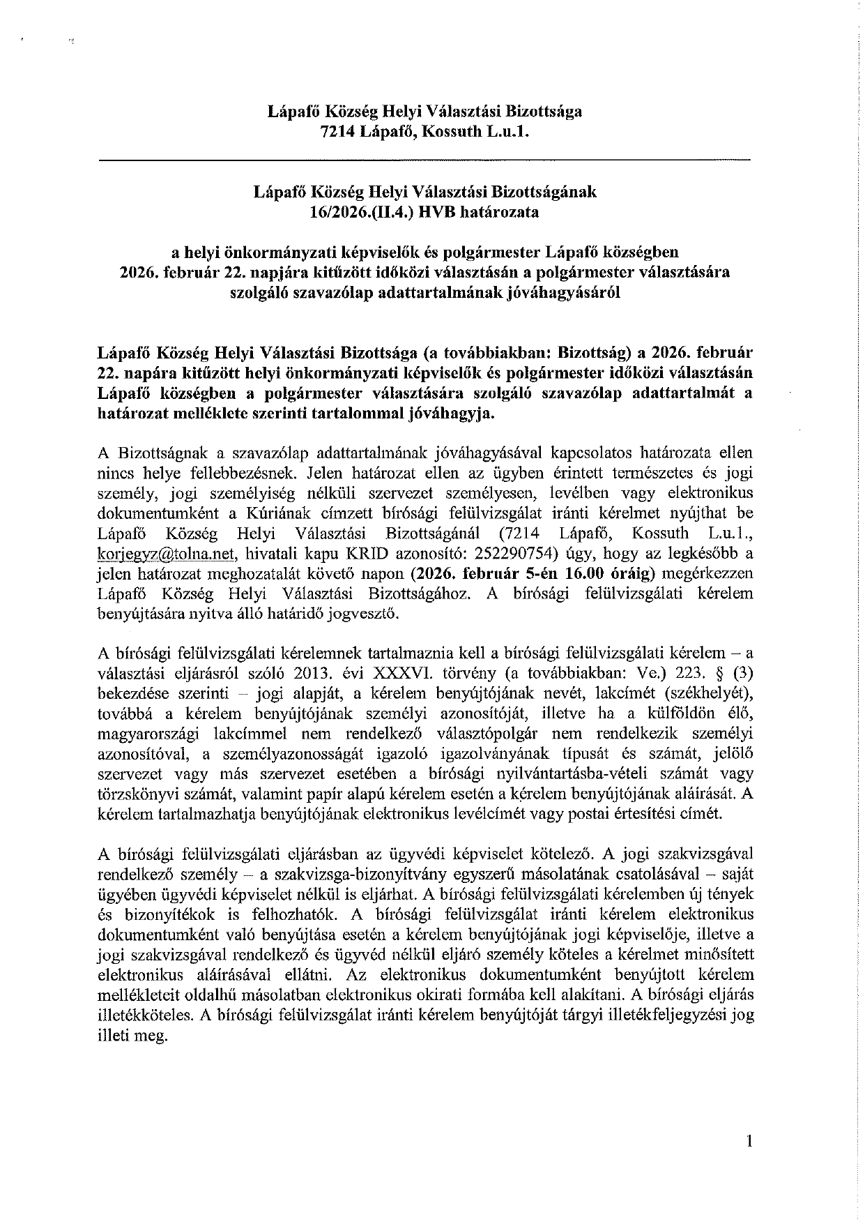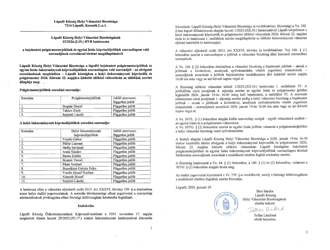 15/2026.(I.19) HVB határozat